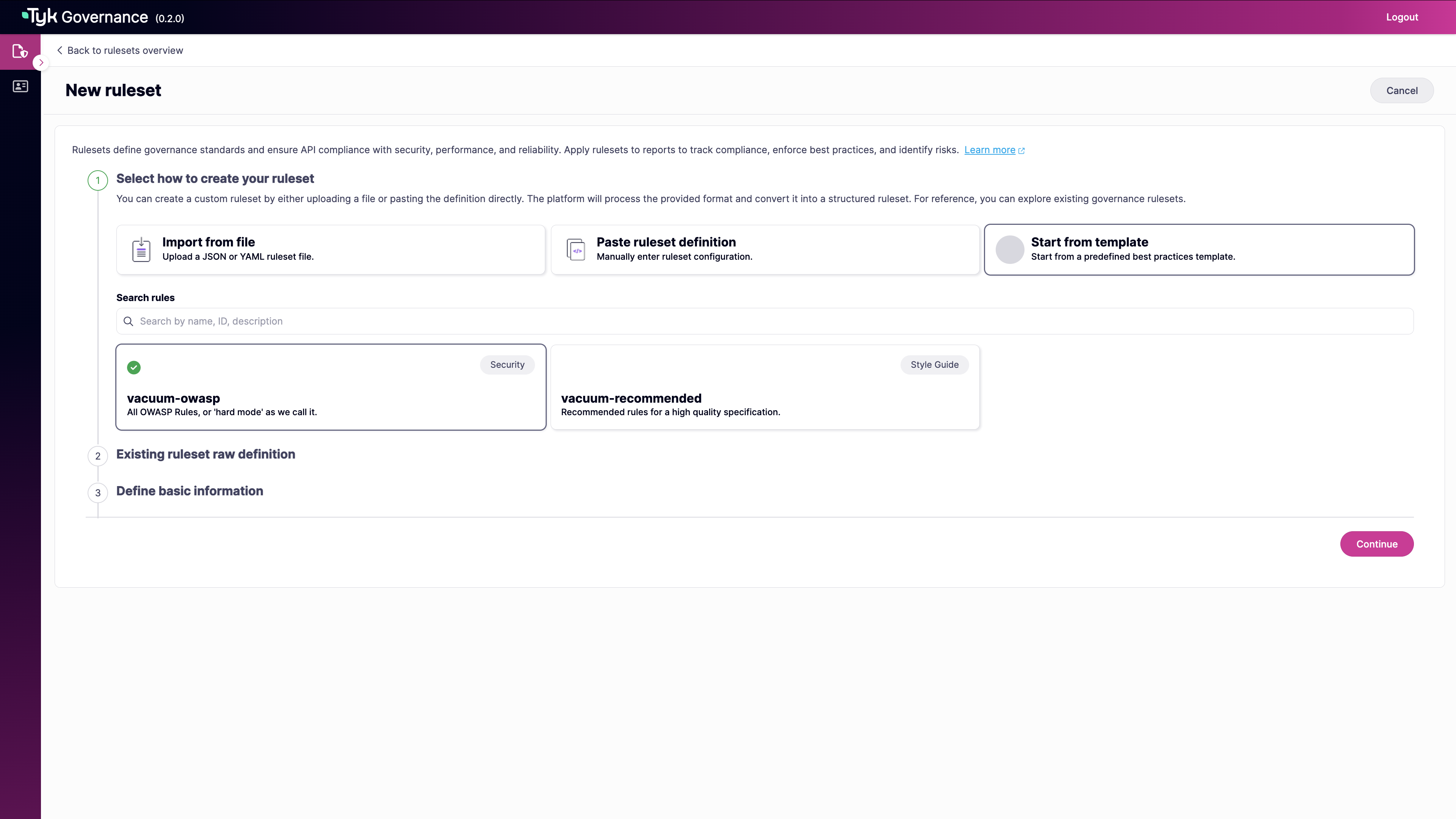 3. Choose how to create your ruleset (import from file, paste definition, or start from template)